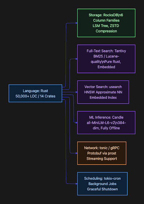Rust was chosen for performance, memory safety, and the ability to run as a long-lived embedded daemon without a garbage collector pausing at inconvenient moments. An agent memory system needs to be invisible. If it adds latency or consumes memory unpredictably, developers stop using it. Rust’s zero-cost abstractions and deterministic memory model make it the right choice for a local background service.
